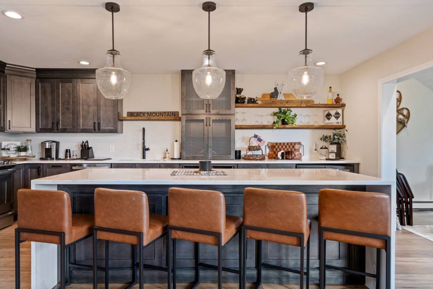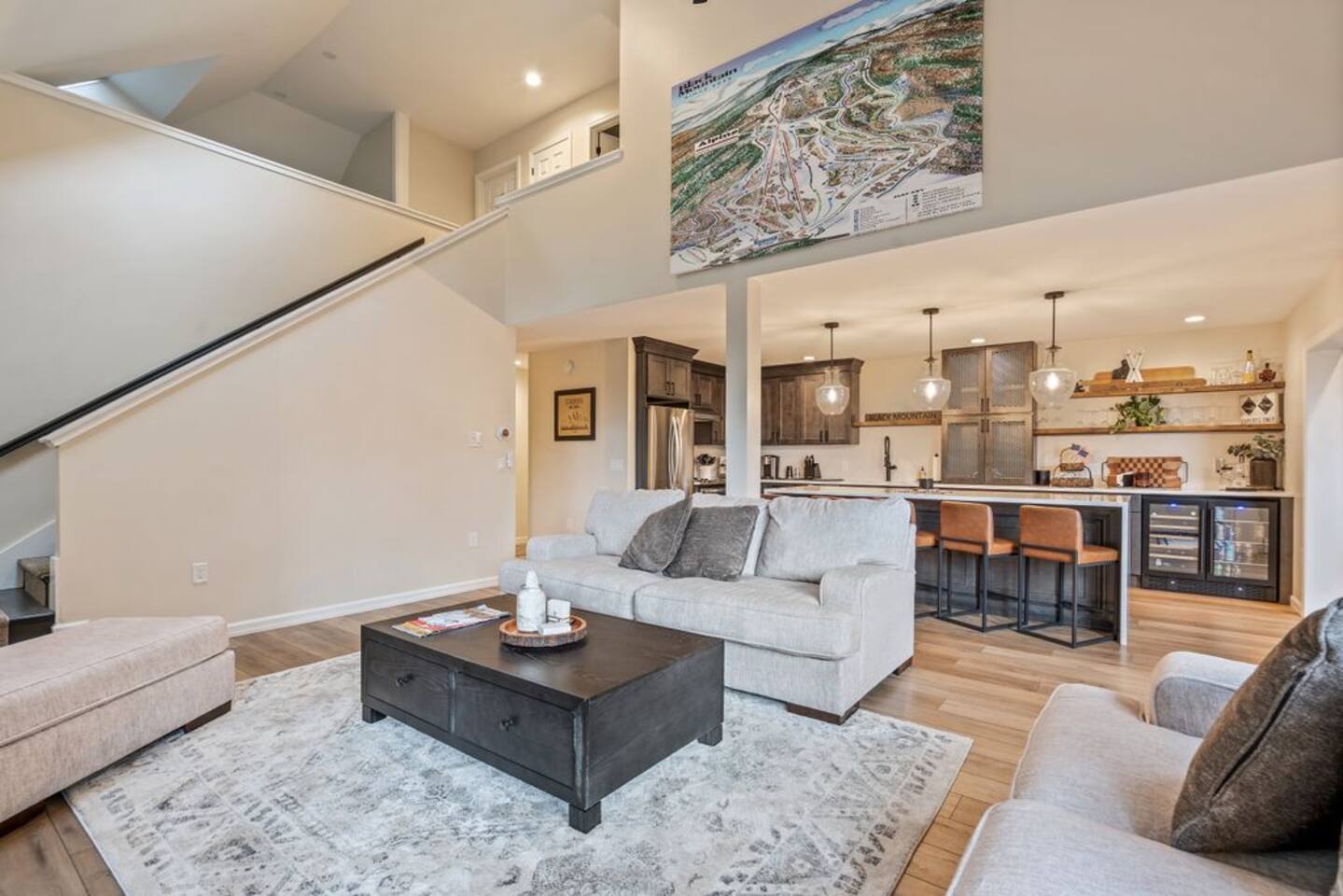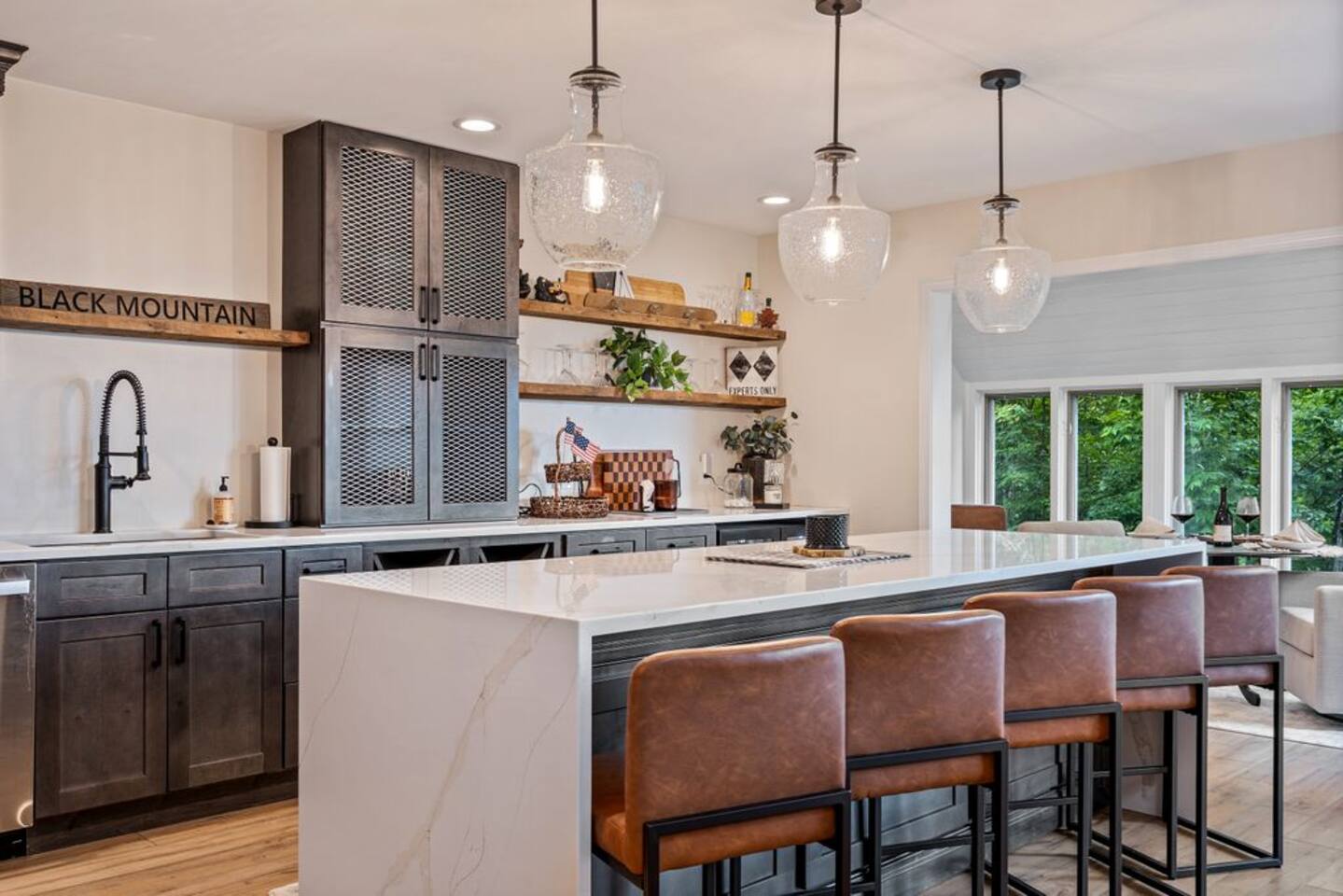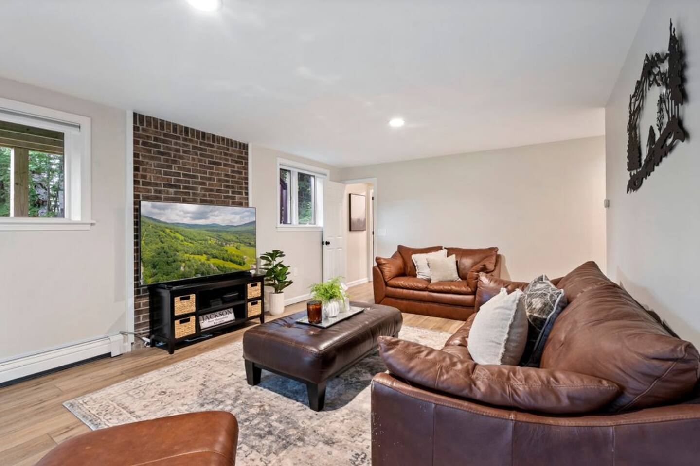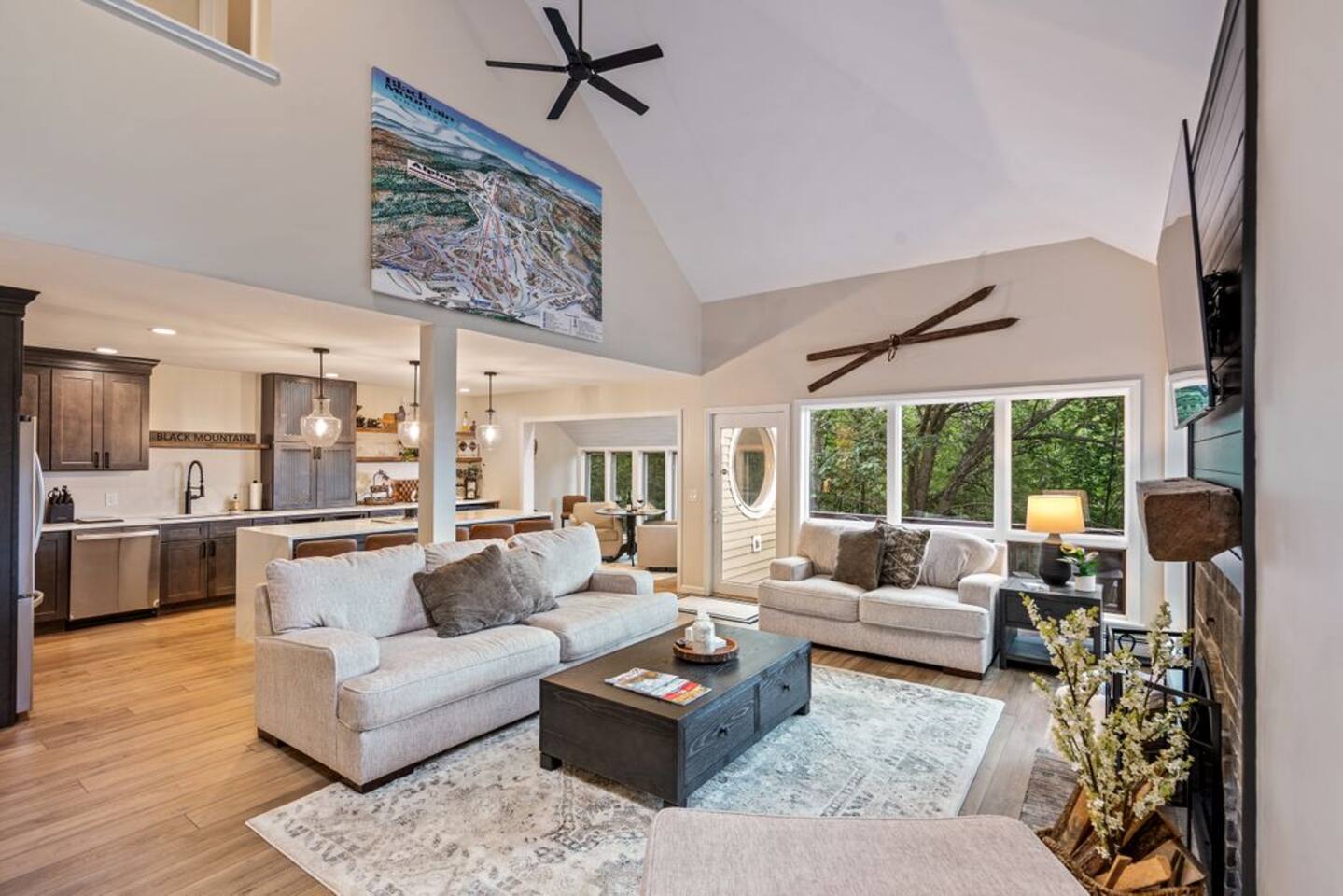 → Sleeps 8- 4 Bedrooms. 1 King, 3 Queens. Full/Full Bunk Bed. → 3 Bathrooms. Shower/tub combo on upper and lower level. → Modern and well-equipped kitchen → Wifi with 2 Smart TV’s. → Office Area → Wine Refrigerator and Coffee Station → Beautiful Views → Board Games and Books → Private viewing deck with BBQ grill → Ideal location to access many attractions ☆☆ BEDROOMS ☆☆ This gorgeous retreat accommodates 8 guests in 4 bedrooms. Experience luxury and comfort on the upper level of this beautiful home, designed with relaxation and convenience in mind. This private upstairs retreat features the primary bedroom with a luxurious king bed, en suite bathroom, spacious closet, and stunning views of Black Mountain. Whether you're traveling for work or leisure, the thoughtfully appointed work area offers a quiet space to stay productive. The cozy loft workspace features a modern desk setup with natural light streaming through a large skylight, perfect for remote work or quiet reading. The room includes a comfortable office chair, essential office supplies, and a plush bean bag chair for relaxation. Warm wood flooring and sloped ceilings add charm to this peaceful and private retreat. The 2nd bedroom, located on the main level, is conveniently located just steps from the kitchen and living area. Unwind in the stylish and serene bedroom featuring a plush queen-size bed, cozy bedding, and calming earthy tones. Large windows provide plenty of natural light and views of the surrounding trees, while modern touches like a ceiling fan, bedside lamps, and a full-length mirror add comfort and convenience. Perfect for a peaceful night’s rest after a day of exploring. The remaining two bedrooms can be found on the lower level. The first of these bedrooms is fitted with a cozy queen bed and tasteful mountain decor. The second bedroom is a charming bunk room-perfect for family and friends. This cozy and stylish bunk room is designed with fun and comfort in mind! Featuring a sturdy, stylish full over full bunk bed and luxurious queen bed. This space easily sleeps four guests — ideal for kids, cousins, or friends traveling together. ☆☆ BATHROOMS ☆☆ Black Diamond Chalet offers 3 full bathrooms, each of them stocked with all the essentials you need for the duration of your stay. The lower level hosts a full bathroom with a combination shower and tub. It is conveniently located just steps from the bunk room and is easily accessible for the guests staying on the lower level. The full bathroom, with a stand up shower, on the main level is well equipped and is conveniently located just steps from the kitchen. The 3rd full bathroom can be accessed on the upper level and is attached to the beautiful primary bedroom. Worry about nothing with these thoughtfully stocked bathrooms that provide everything you need and more. ☆☆ KITCHEN & LIVING AREA ☆☆ The bright and airy kitchen is fully equipped with all the appliances, utensils and cookware you need to feel at home. This thoughtfully-designed home provides eat-in dining for 8 guests at the island and a gorgeous wooden table. Gather in style in the beautifully designed open-concept living area, perfect for relaxing after a day of adventure. The space features soaring vaulted ceilings, mounted Smart TV, and large windows that flood the room with natural light while offering peaceful views of the surrounding Black Mountain. Two plush sofas and a cushioned armchair provide ample seating for group conversations or movie nights. The adjacent kitchen is a chef’s dream, fully equipped with stainless steel appliances, a farmhouse sink, and a spacious island with bar seating—ideal for casual breakfasts or evening cocktails. Rustic wood finishes and mountain-themed décor, including vintage skis and a detailed Black Mountain trail map, add charm and character to the space. Whether you're enjoying a home-cooked meal, playing board games, or simply unwinding with a cup of coffee, this warm and inviting living area is the heart of the home. The lower level living area boats additional living space-Perfect for Movie Nights & Family Games!Welcome to your perfect retreat for relaxation and connection. This warm and inviting living room is designed with comfort in mind—featuring rich leather sofas, a soft, oversized rug, and a charming rustic décor that brings the outdoors in. Large sliding glass doors flood the space with natural light and open to serene forest views, making it the ideal spot to enjoy your morning coffee or unwind with a glass of wine. Whether you're gathering for family movie night, playing games, or simply kicking back after a day of adventure, this cozy space will quickly feel like home. ☆☆ OUTSIDE SPACE ☆☆ The exterior area of this home offers gorgeous views and ample privacy. Off of the main level, guests will find the back deck. The deck is the perfect gathering area to relax with a drink of your choice after a day of enjoying the area. Sit back and relax while a meal is prepared on the BBQ. Step outside on the lower level and unwind beneath the charming string lights on your private covered patio—perfect for evening chats, outdoor dining, or simply soaking in the peaceful surroundings. Tucked under the deck and surrounded by lush greenery, this inviting space offers both shade and seclusion.This cozy nook brings nature and comfort together beautifully.The choice is yours and either option is the perfect spot to make memories that will last forever. ★☆ Book Today & Let Us Take Care Of You in Jackson☆★