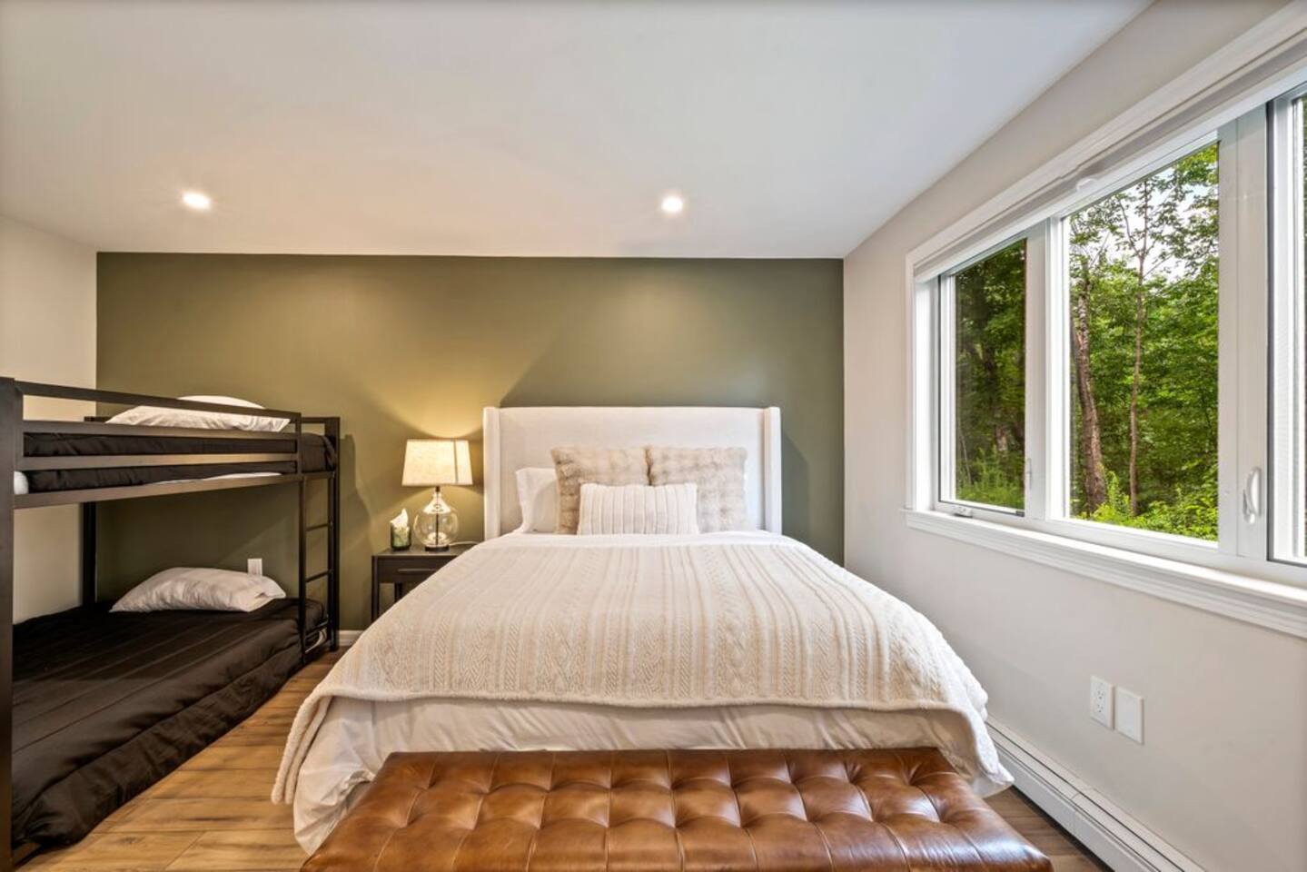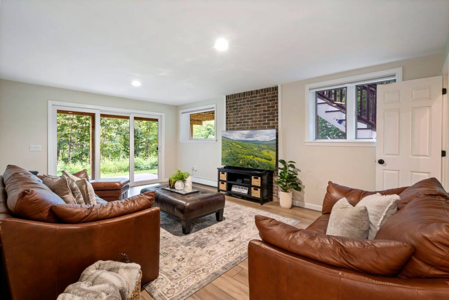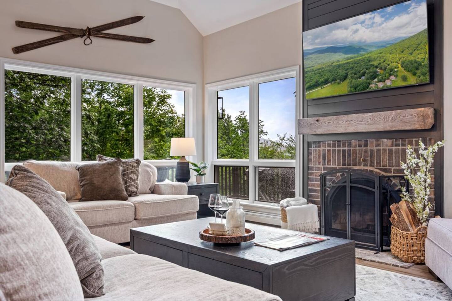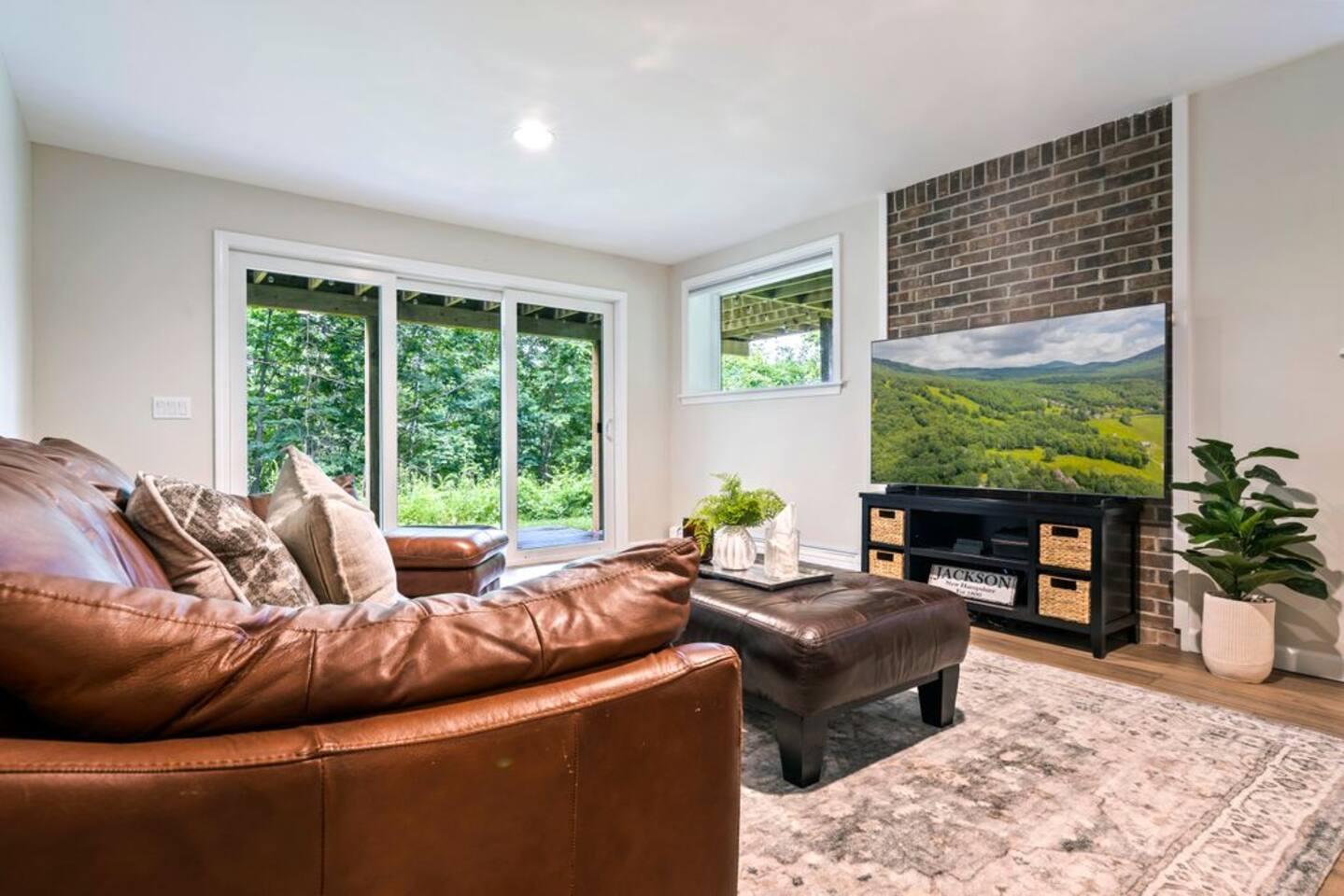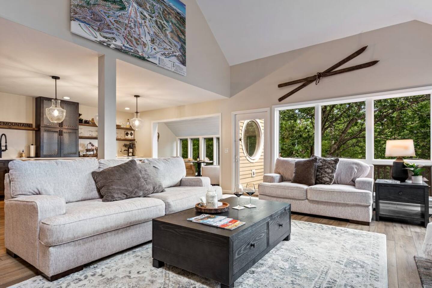 → Sleeps 8- 4 Bedrooms. 1 King, 3 Queens. Full/Full Bunk Bed. → 3 Bathrooms. Shower/tub combo on upper and lower level. → Modern and well-equipped kitchen → Wifi with 2 Smart TV’s. → Office Area → Wine Refrigerator and Coffee Station → Beautiful Views → Board Games and Books → Private viewing deck with BBQ grill → Ideal location to access many attractions ☆☆ BEDROOMS ☆☆ This gorgeous retreat accommodates 8 guests in 4 bedrooms. Experience luxury and comfort on the upper level of this beautiful home, designed with relaxation and convenience in mind. This private upstairs retreat features the primary bedroom with a luxurious king bed, en suite bathroom, spacious closet, and stunning views of Black Mountain. Whether you're traveling for work or leisure, the thoughtfully appointed work area offers a quiet space to stay productive. The cozy loft workspace features a modern desk setup with natural light streaming through a large skylight, perfect for remote work or quiet reading. The room includes a comfortable office chair, essential office supplies, and a plush bean bag chair for relaxation. Warm wood flooring and sloped ceilings add charm to this peaceful and private retreat. The 2nd bedroom, located on the main level, is conveniently located just steps from the kitchen and living area. Unwind in the stylish and serene bedroom featuring a plush queen-size bed, cozy bedding, and calming earthy tones. Large windows provide plenty of natural light and views of the surrounding trees, while modern touches like a ceiling fan, bedside lamps, and a full-length mirror add comfort and convenience. Perfect for a peaceful night’s rest after a day of exploring. The remaining two bedrooms can be found on the lower level. The first of these bedrooms is fitted with a cozy queen bed and tasteful mountain decor. The second bedroom is a charming bunk room-perfect for family and friends. This cozy and stylish bunk room is designed with fun and comfort in mind! Featuring a sturdy, stylish full over full bunk bed and luxurious queen bed. This space easily sleeps four guests — ideal for kids, cousins, or friends traveling together. ☆☆ BATHROOMS ☆☆ Black Diamond Chalet offers 3 full bathrooms, each of them stocked with all the essentials you need for the duration of your stay. The lower level hosts a full bathroom with a combination shower and tub. It is conveniently located just steps from the bunk room and is easily accessible for the guests staying on the lower level. The full bathroom, with a stand up shower, on the main level is well equipped and is conveniently located just steps from the kitchen. The 3rd full bathroom can be accessed on the upper level and is attached to the beautiful primary bedroom. Worry about nothing with these thoughtfully stocked bathrooms that provide everything you need and more. ☆☆ KITCHEN & LIVING AREA ☆☆ The bright and airy kitchen is fully equipped with all the appliances, utensils and cookware you need to feel at home. This thoughtfully-designed home provides eat-in dining for 8 guests at the island and a gorgeous wooden table. Gather in style in the beautifully designed open-concept living area, perfect for relaxing after a day of adventure. The space features soaring vaulted ceilings, mounted Smart TV, and large windows that flood the room with natural light while offering peaceful views of the surrounding Black Mountain. Two plush sofas and a cushioned armchair provide ample seating for group conversations or movie nights. The adjacent kitchen is a chef’s dream, fully equipped with stainless steel appliances, a farmhouse sink, and a spacious island with bar seating—ideal for casual breakfasts or evening cocktails. Rustic wood finishes and mountain-themed décor, including vintage skis and a detailed Black Mountain trail map, add charm and character to the space. Whether you're enjoying a home-cooked meal, playing board games, or simply unwinding with a cup of coffee, this warm and inviting living area is the heart of the home. The lower level living area boats additional living space-Perfect for Movie Nights & Family Games!Welcome to your perfect retreat for relaxation and connection. This warm and inviting living room is designed with comfort in mind—featuring rich leather sofas, a soft, oversized rug, and a charming rustic décor that brings the outdoors in. Large sliding glass doors flood the space with natural light and open to serene forest views, making it the ideal spot to enjoy your morning coffee or unwind with a glass of wine. Whether you're gathering for family movie night, playing games, or simply kicking back after a day of adventure, this cozy space will quickly feel like home. ☆☆ OUTSIDE SPACE ☆☆ The exterior area of this home offers gorgeous views and ample privacy. Off of the main level, guests will find the back deck. The deck is the perfect gathering area to relax with a drink of your choice after a day of enjoying the area. Sit back and relax while a meal is prepared on the BBQ. Step outside on the lower level and unwind beneath the charming string lights on your private covered patio—perfect for evening chats, outdoor dining, or simply soaking in the peaceful surroundings. Tucked under the deck and surrounded by lush greenery, this inviting space offers both shade and seclusion.This cozy nook brings nature and comfort together beautifully.The choice is yours and either option is the perfect spot to make memories that will last forever. ★☆ Book Today & Let Us Take Care Of You in Jackson☆★