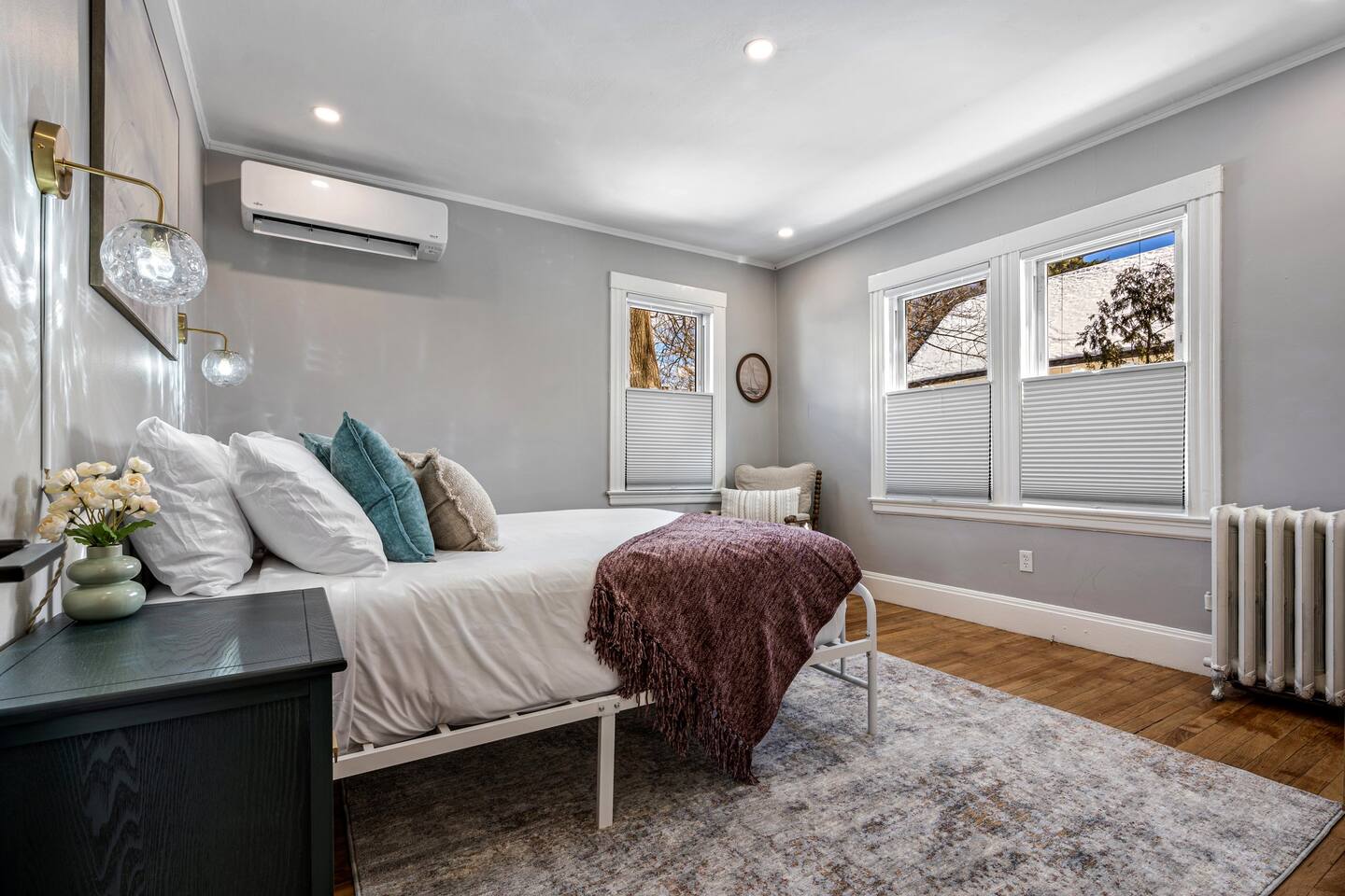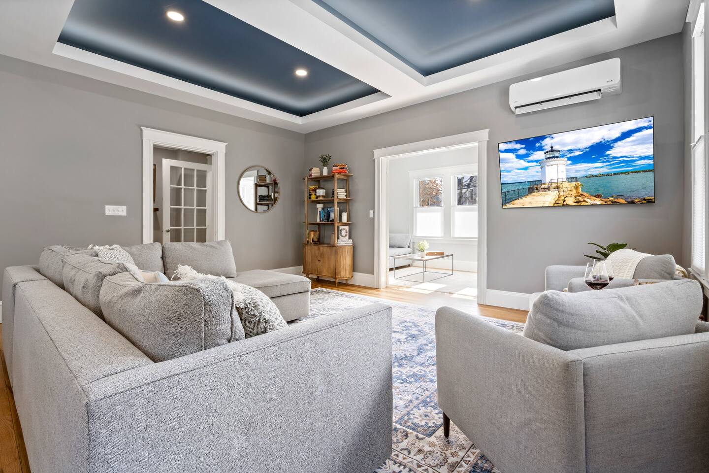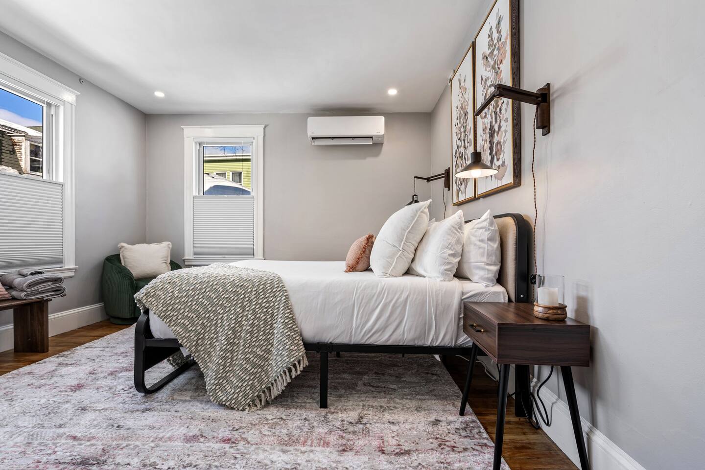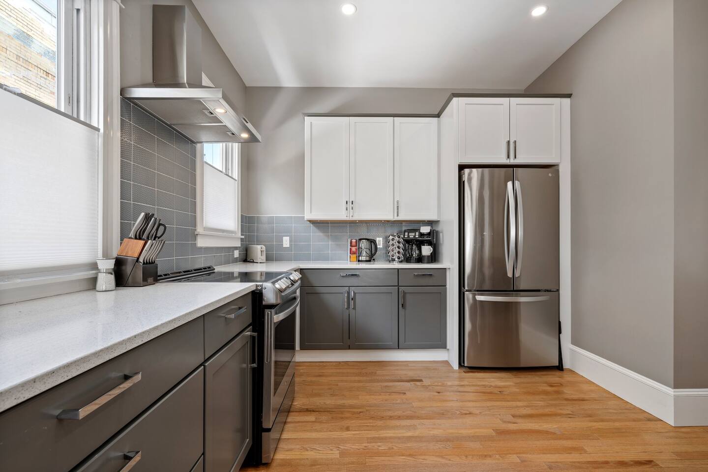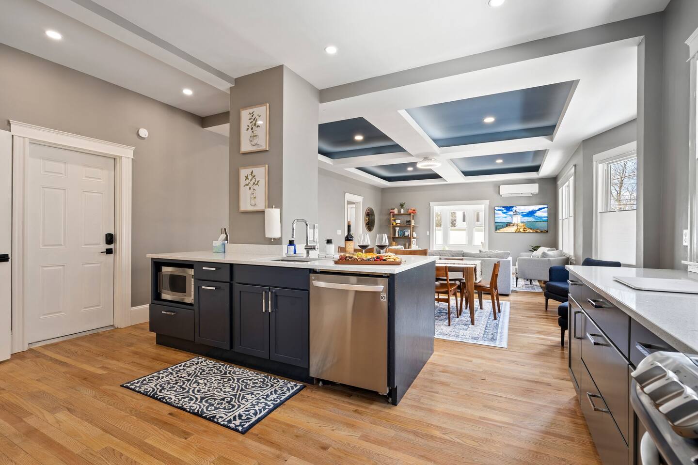 → Sleeps 16 | 6 Bedrooms | Queen Beds → Two sofa beds → Queen Air Mattress for additional guests → 4.5 Bathrooms → Two fully equipped kitchens → Two dining areas + breakfast bar seating → Two living rooms with Smart TVs → Board games & bay window seating → High-speed Wi-Fi → Washer & dryer in both units → Mini-split heating & AC in select bedrooms → High chair for families → Free on-site parking for select vehicles + free street parking nearby → Private balcony ☆☆ BEDROOMS ☆☆ The property features six spacious bedrooms designed as private, tranquil retreats for deep relaxation and privacy. Each room is a customized sanctuary equipped with its own split-system climate control, ensuring every guest can enjoy a personalized temperature for a perfect night's sleep. These quarters are styled with premium linens and a diverse range of high-end aesthetics, varying from serene nautical blue accents to sophisticated wood finishes and modern furniture that creates a boutique atmosphere. Beyond the comfort of the beds, the rooms are filled with thoughtful and stylish details. Guests will find functional touches such as arched gold-framed mirrors, designer rugs, and ambient bedside lighting that adds a warm glow to the space. For added convenience, each room offers ample storage in spacious dressers and nightstands, along with cozy accent chairs that provide the perfect corner for a quiet moment of reading or morning coffee. For additional flexibility, the home also provides a Queen air mattress available for additional guests if needed. ☆☆ BATHROOMS ☆☆ The property features four spa-inspired bathrooms and a convenient half-bath, each blending high-end functionality with sophisticated design. The primary bathrooms offer diverse bathing experiences, ranging from large glass-enclosed showers with custom mosaic tiling to full bathtubs with sliding glass doors. Each space is thoughtfully detailed with premium finishes, including marble vanities, modern integrated LED mirrors, and designer fixtures that range from contemporary chrome to elegant vintage-style brass. To ensure comfort for large groups, the bathrooms are equipped with ample storage and bright, airy layouts enhanced by natural light from strategically placed windows. Stylish touches such as decorative floral artwork, patterned tile flooring, and curated wall lighting create a boutique feel throughout. The addition of a clean, minimalist half-bath with a dedicated vanity provides extra convenience for guests during their stay. ☆☆ KITCHEN & LIVING AREA ☆☆ The home features two fully equipped kitchens and expansive social areas that are naturally bathed in sunshine. Each kitchen is designed with a modern aesthetic, boasting sleek charcoal cabinetry, high-end stainless steel appliances, and large islands that double as breakfast bars. These bright, open spaces flow seamlessly into the dual living rooms, where elegant coffered ceilings and plush sectional seating with two comfortable sofa beds for additional sleeping space are highlighted by the abundant natural light and direct access to a private balcony, extending the living space outdoors and creating an airy, inviting atmosphere. The property offers two distinct dining areas perfectly suited for hosting large groups. The main dining space features a grand wooden table that comfortably seats eight, set under a sophisticated ceiling design that creates a formal yet inviting atmosphere for shared meals. A second, more casual dining area provides additional flexibility, ensuring there is plenty of room for everyone to gather, eat, and socialize without ever feeling crowded. ☆☆ LOCATION ☆☆ Stay close to Portland’s best attractions while enjoying a quiet residential setting. 🎨 Arts District (10 min) – Museums, galleries, cafés, and creative energy. 🎭 State Theatre (10 min) – A historic venue hosting live performances and concerts. 🌊 Old Port & Eastern Promenade (10 min) – Waterfront views, cobblestone streets, shops, and restaurants. 🌳 Payson Park (8 min) – Expansive green space with recreation areas and trails. 🌅 Fort Allen Park (12 min) – Scenic views of Casco Bay and historic landmarks. ☆☆ COMFORT & CONVENIENCE ☆☆ ✔ High-speed Wi-Fi ✔ Smart TV ✔ Books & board games ✔ Hair dryer, fresh linens, and towels provided ✔ Coffee makers (Keurig + drip) ✔ In-unit washer & dryer ✔ Pack ’n Play for families