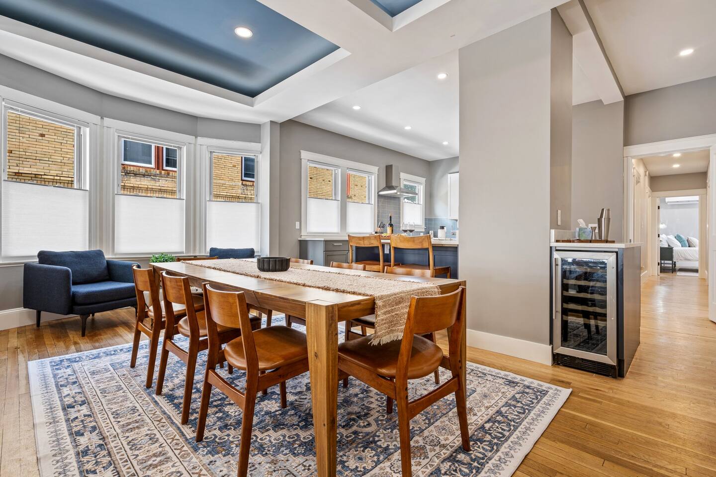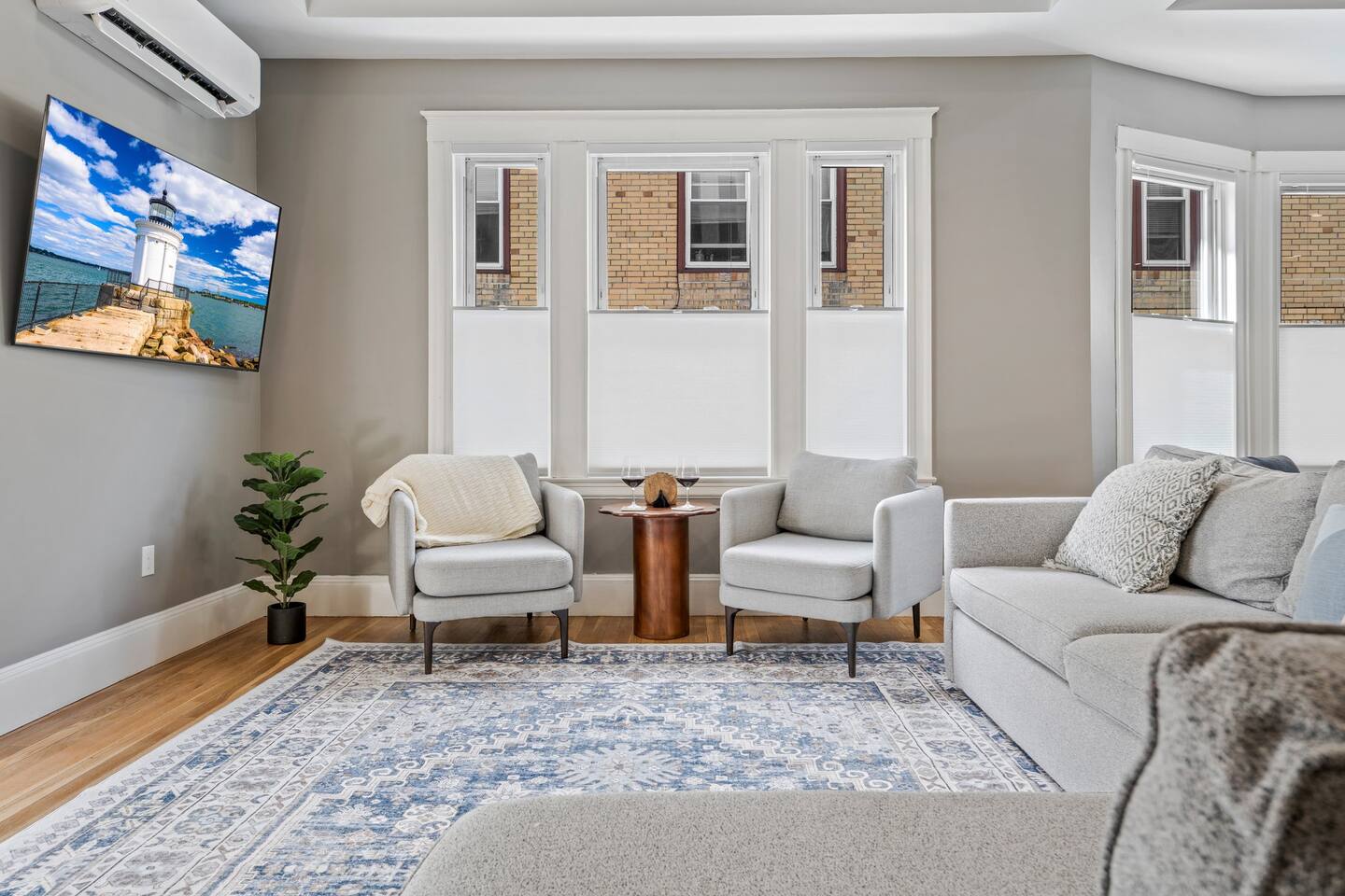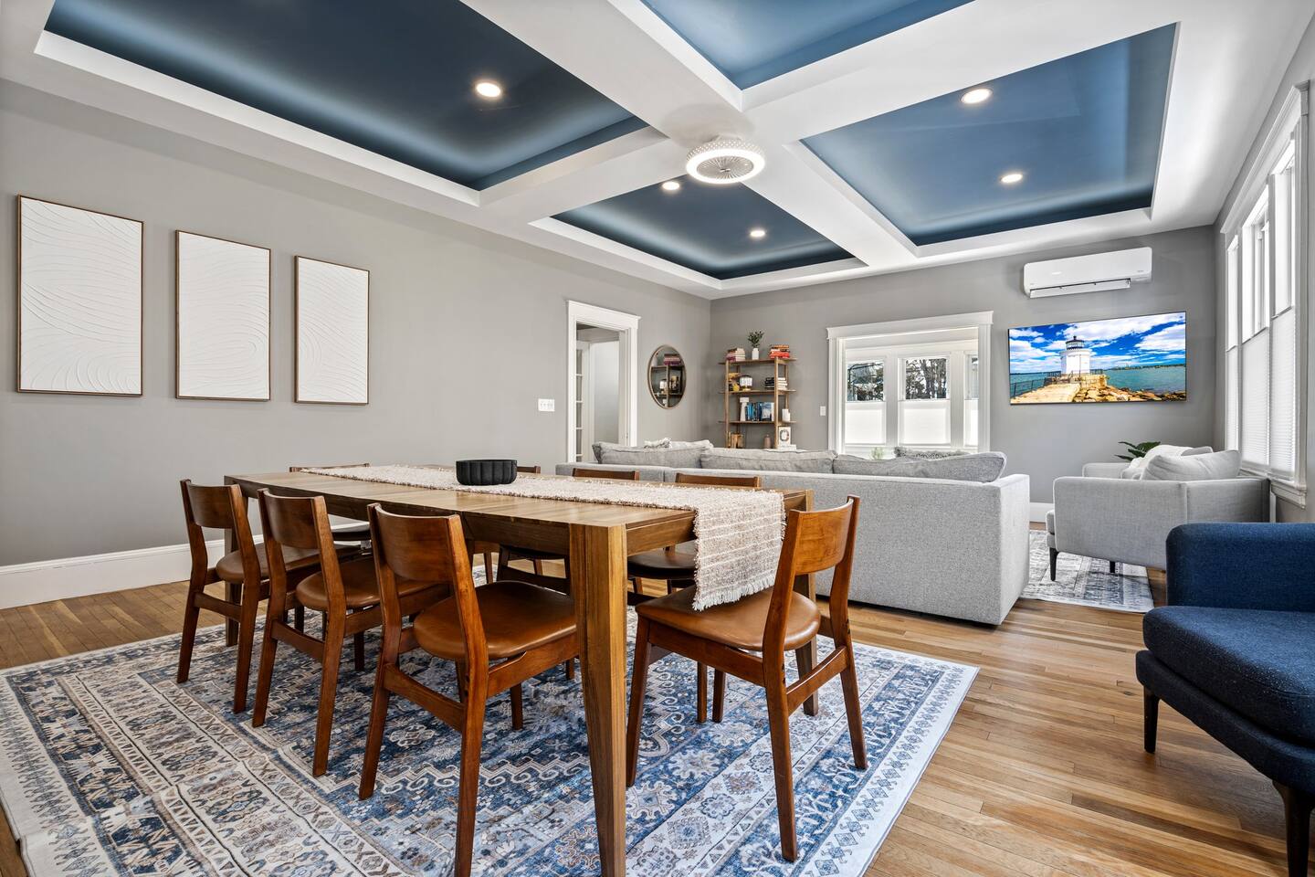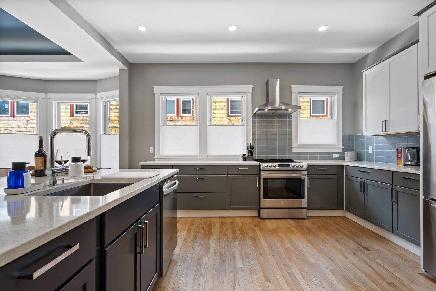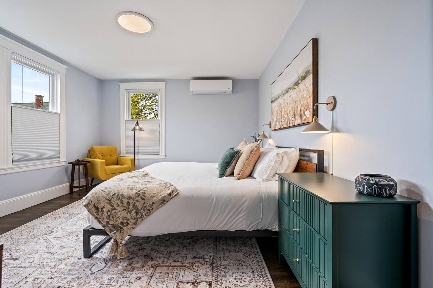 → Sleeps 16 | 6 Bedrooms | Queen Beds → Two sofa beds → Queen Air Mattress for additional guests → 4.5 Bathrooms → Two fully equipped kitchens → Two dining areas + breakfast bar seating → Two living rooms with Smart TVs → Board games & bay window seating → High-speed Wi-Fi → Washer & dryer in both units → Mini-split heating & AC in select bedrooms → High chair for families → Free on-site parking for select vehicles + free street parking nearby → Private balcony ☆☆ BEDROOMS ☆☆ The property features six spacious bedrooms designed as private, tranquil retreats for deep relaxation and privacy. Each room is a customized sanctuary equipped with its own split-system climate control, ensuring every guest can enjoy a personalized temperature for a perfect night's sleep. These quarters are styled with premium linens and a diverse range of high-end aesthetics, varying from serene nautical blue accents to sophisticated wood finishes and modern furniture that creates a boutique atmosphere. Beyond the comfort of the beds, the rooms are filled with thoughtful and stylish details. Guests will find functional touches such as arched gold-framed mirrors, designer rugs, and ambient bedside lighting that adds a warm glow to the space. For added convenience, each room offers ample storage in spacious dressers and nightstands, along with cozy accent chairs that provide the perfect corner for a quiet moment of reading or morning coffee. For additional flexibility, the home also provides a Queen air mattress available for additional guests if needed. ☆☆ BATHROOMS ☆☆ The property features four spa-inspired bathrooms and a convenient half-bath, each blending high-end functionality with sophisticated design. The primary bathrooms offer diverse bathing experiences, ranging from large glass-enclosed showers with custom mosaic tiling to full bathtubs with sliding glass doors. Each space is thoughtfully detailed with premium finishes, including marble vanities, modern integrated LED mirrors, and designer fixtures that range from contemporary chrome to elegant vintage-style brass. To ensure comfort for large groups, the bathrooms are equipped with ample storage and bright, airy layouts enhanced by natural light from strategically placed windows. Stylish touches such as decorative floral artwork, patterned tile flooring, and curated wall lighting create a boutique feel throughout. The addition of a clean, minimalist half-bath with a dedicated vanity provides extra convenience for guests during their stay. ☆☆ KITCHEN & LIVING AREA ☆☆ The home features two fully equipped kitchens and expansive social areas that are naturally bathed in sunshine. Each kitchen is designed with a modern aesthetic, boasting sleek charcoal cabinetry, high-end stainless steel appliances, and large islands that double as breakfast bars. These bright, open spaces flow seamlessly into the dual living rooms, where elegant coffered ceilings and plush sectional seating with two comfortable sofa beds for additional sleeping space are highlighted by the abundant natural light and direct access to a private balcony, extending the living space outdoors and creating an airy, inviting atmosphere. The property offers two distinct dining areas perfectly suited for hosting large groups. The main dining space features a grand wooden table that comfortably seats eight, set under a sophisticated ceiling design that creates a formal yet inviting atmosphere for shared meals. A second, more casual dining area provides additional flexibility, ensuring there is plenty of room for everyone to gather, eat, and socialize without ever feeling crowded. ☆☆ LOCATION ☆☆ Stay close to Portland’s best attractions while enjoying a quiet residential setting. 🎨 Arts District (10 min) – Museums, galleries, cafés, and creative energy. 🎭 State Theatre (10 min) – A historic venue hosting live performances and concerts. 🌊 Old Port & Eastern Promenade (10 min) – Waterfront views, cobblestone streets, shops, and restaurants. 🌳 Payson Park (8 min) – Expansive green space with recreation areas and trails. 🌅 Fort Allen Park (12 min) – Scenic views of Casco Bay and historic landmarks. ☆☆ COMFORT & CONVENIENCE ☆☆ ✔ High-speed Wi-Fi ✔ Smart TV ✔ Books & board games ✔ Hair dryer, fresh linens, and towels provided ✔ Coffee makers (Keurig + drip) ✔ In-unit washer & dryer ✔ Pack ’n Play for families