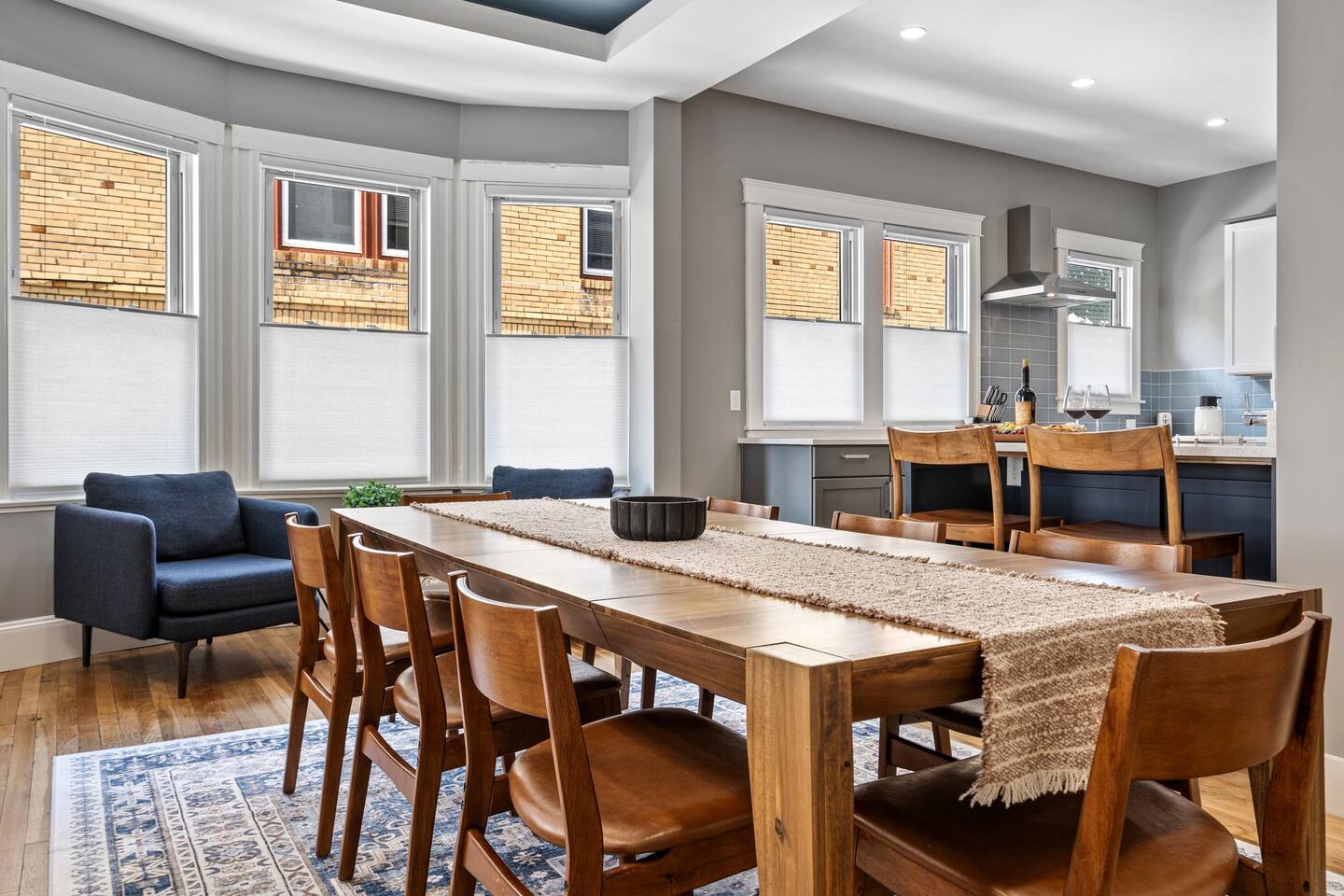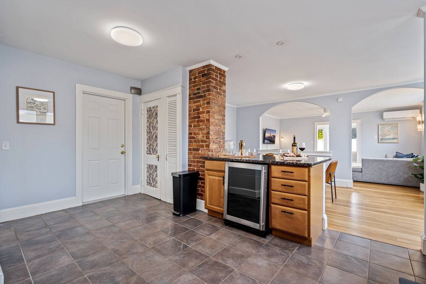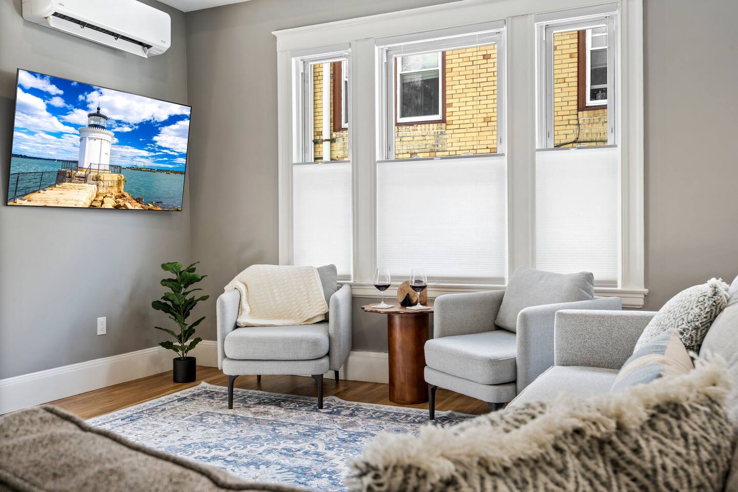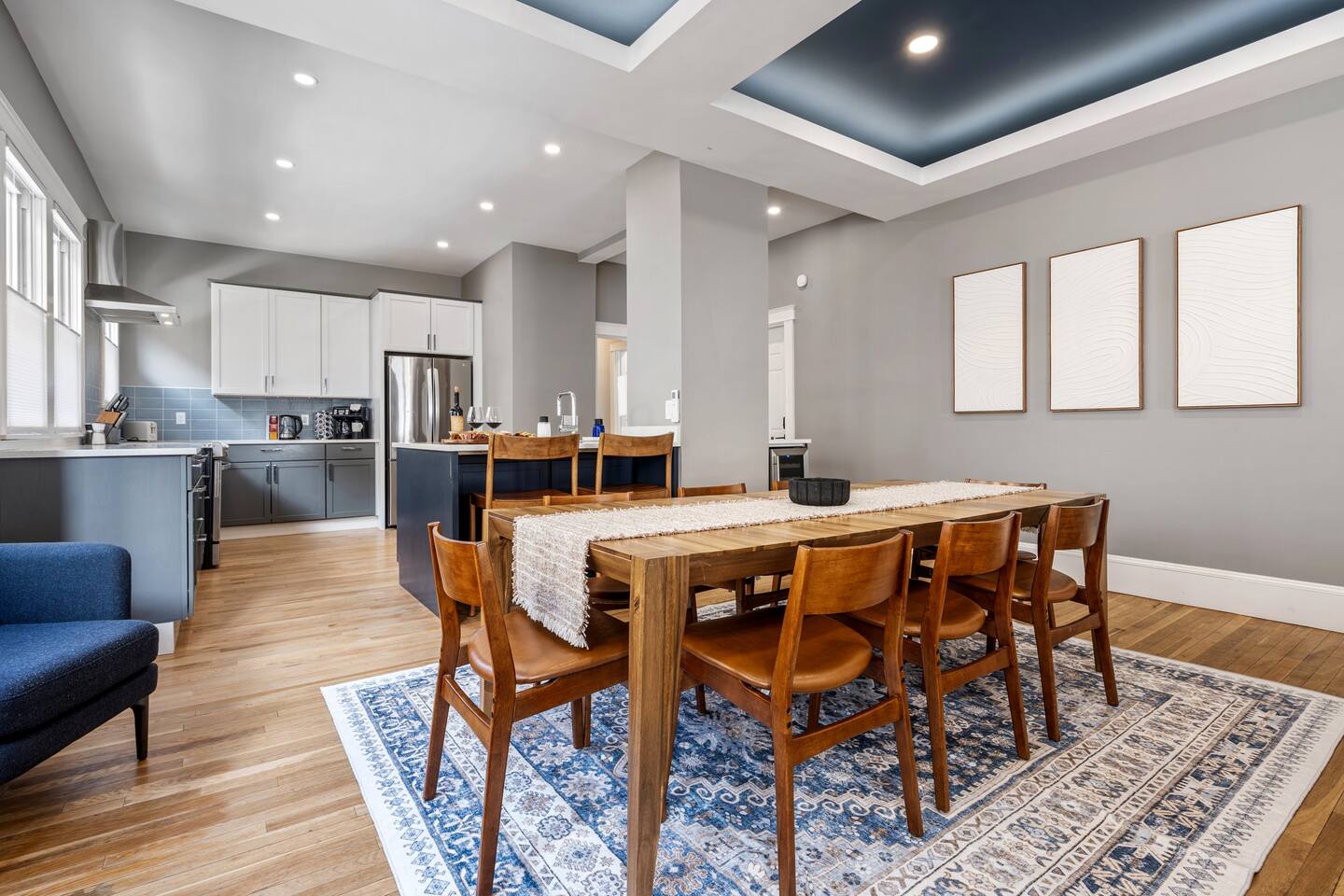 → Sleeps 16 | 6 Bedrooms | Queen Beds → Two sofa beds → Queen Air Mattress for additional guests → 4.5 Bathrooms → Two fully equipped kitchens → Two dining areas + breakfast bar seating → Two living rooms with Smart TVs → Board games & bay window seating → High-speed Wi-Fi → Washer & dryer in both units → Mini-split heating & AC in select bedrooms → High chair for families → Free on-site parking for select vehicles + free street parking nearby → Private balcony ☆☆ BEDROOMS ☆☆ The property features six spacious bedrooms designed as private, tranquil retreats for deep relaxation and privacy. Each room is a customized sanctuary equipped with its own split-system climate control, ensuring every guest can enjoy a personalized temperature for a perfect night's sleep. These quarters are styled with premium linens and a diverse range of high-end aesthetics, varying from serene nautical blue accents to sophisticated wood finishes and modern furniture that creates a boutique atmosphere. Beyond the comfort of the beds, the rooms are filled with thoughtful and stylish details. Guests will find functional touches such as arched gold-framed mirrors, designer rugs, and ambient bedside lighting that adds a warm glow to the space. For added convenience, each room offers ample storage in spacious dressers and nightstands, along with cozy accent chairs that provide the perfect corner for a quiet moment of reading or morning coffee. For additional flexibility, the home also provides a Queen air mattress available for additional guests if needed. ☆☆ BATHROOMS ☆☆ The property features four spa-inspired bathrooms and a convenient half-bath, each blending high-end functionality with sophisticated design. The primary bathrooms offer diverse bathing experiences, ranging from large glass-enclosed showers with custom mosaic tiling to full bathtubs with sliding glass doors. Each space is thoughtfully detailed with premium finishes, including marble vanities, modern integrated LED mirrors, and designer fixtures that range from contemporary chrome to elegant vintage-style brass. To ensure comfort for large groups, the bathrooms are equipped with ample storage and bright, airy layouts enhanced by natural light from strategically placed windows. Stylish touches such as decorative floral artwork, patterned tile flooring, and curated wall lighting create a boutique feel throughout. The addition of a clean, minimalist half-bath with a dedicated vanity provides extra convenience for guests during their stay. ☆☆ KITCHEN & LIVING AREA ☆☆ The home features two fully equipped kitchens and expansive social areas that are naturally bathed in sunshine. Each kitchen is designed with a modern aesthetic, boasting sleek charcoal cabinetry, high-end stainless steel appliances, and large islands that double as breakfast bars. These bright, open spaces flow seamlessly into the dual living rooms, where elegant coffered ceilings and plush sectional seating with two comfortable sofa beds for additional sleeping space are highlighted by the abundant natural light and direct access to a private balcony, extending the living space outdoors and creating an airy, inviting atmosphere. The property offers two distinct dining areas perfectly suited for hosting large groups. The main dining space features a grand wooden table that comfortably seats eight, set under a sophisticated ceiling design that creates a formal yet inviting atmosphere for shared meals. A second, more casual dining area provides additional flexibility, ensuring there is plenty of room for everyone to gather, eat, and socialize without ever feeling crowded. ☆☆ LOCATION ☆☆ Stay close to Portland’s best attractions while enjoying a quiet residential setting. 🎨 Arts District (10 min) – Museums, galleries, cafés, and creative energy. 🎭 State Theatre (10 min) – A historic venue hosting live performances and concerts. 🌊 Old Port & Eastern Promenade (10 min) – Waterfront views, cobblestone streets, shops, and restaurants. 🌳 Payson Park (8 min) – Expansive green space with recreation areas and trails. 🌅 Fort Allen Park (12 min) – Scenic views of Casco Bay and historic landmarks. ☆☆ COMFORT & CONVENIENCE ☆☆ ✔ High-speed Wi-Fi ✔ Smart TV ✔ Books & board games ✔ Hair dryer, fresh linens, and towels provided ✔ Coffee makers (Keurig + drip) ✔ In-unit washer & dryer ✔ Pack ’n Play for families