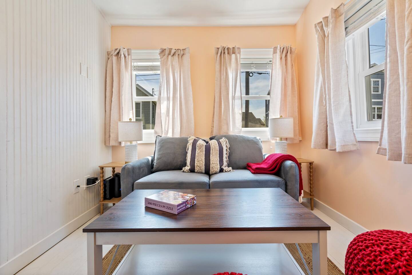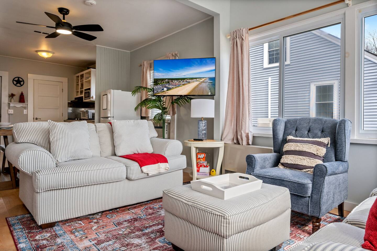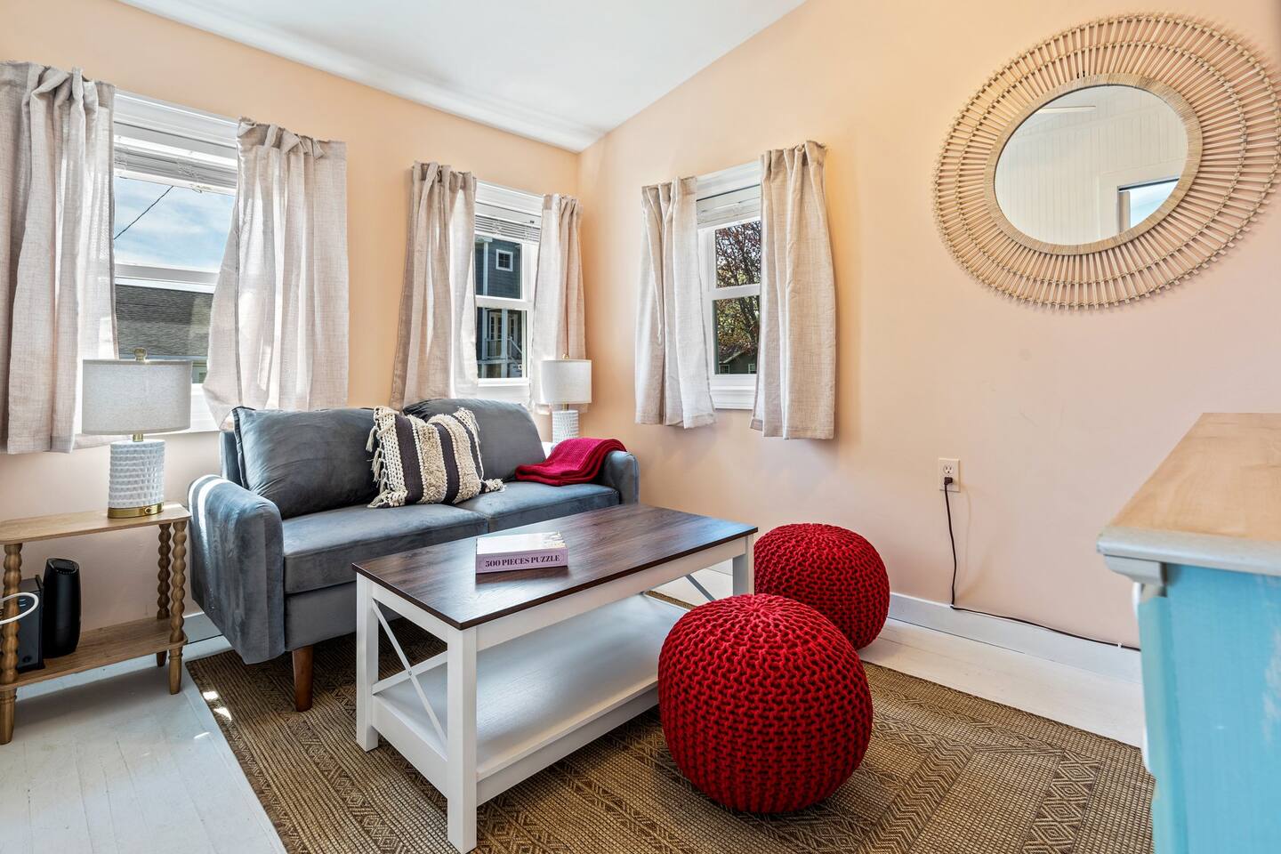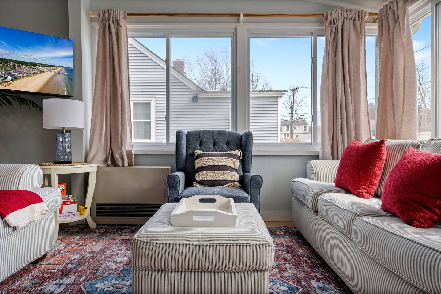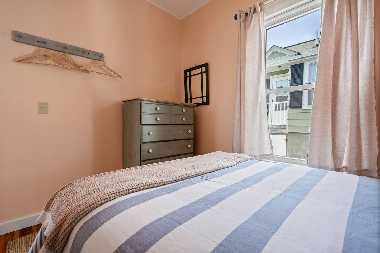 → Sleeps 6. 2 Bedrooms. 2 Queen beds. 1 Queen pull-out → 1 Bathroom with stand-up shower. → Modern and well-equipped kitchen → Wifi with 2 Smart TV’s → Outdoor Shower → Outdoor Dining → Beach Cruiser Bike → Board Games and Books → Dog-Friendly → Ideal location to access many attractions ☆☆ BEDROOMS ☆☆ These newly designed bedrooms are perfect for restful nights and peaceful mornings. The 1st bedroom features a plush queen-sized bed with fresh, modern striped linens, a soft knitted throw, and a bold navy accent pillow; this space blends coastal charm with cozy elegance. Natural light pours through the window dressed in light, airy curtains, giving the room a warm, inviting glow. Tasteful touches like twin bedside lamps, a serene ocean-inspired painting, and soft peach-toned walls create a calming ambiance ideal for relaxation. Settle into the charming and functional 2nd bedroom, designed with comfort and practicality in mind. The room features a plush bed with soft, striped linens and cozy throws—perfect for a restful night's sleep. Sunlight filters through airy curtains, adding a warm glow to the serene space.Enjoy the convenience of a private in-room washer and dryer. Whether you're here to relax or recharge between adventures, this bedroom offers a peaceful retreat in a clean, well-equipped setting. ☆☆ BATHROOM ☆☆ There is one full bathroom, along with an outdoor shower, fully stocked with all the essentials you need for the duration of your stay. The full bathroom offers a stand-up shower and is conveniently located right off of the kitchen. Worry about nothing with this thoughtfully stocked bathroom that provides everything you need and more for your stay at Orchard Peach. ☆☆ KITCHEN & LIVING AREA ☆☆ The bright and airy kitchen is fully equipped with all the appliances, utensils, and cookware you need to feel at home. This thoughtfully-designed home provides a unique eat-in option at a beautiful dining table with bench seating that accommodates all 6 guests. The living area is situated just off of the kitchen and is kitted with an HDTV with a Roku entertainment system, allowing full access to your favorite streaming services. Sink into the plush sofa in the living area, where you can curl up with a good book or simply gaze out the window at the tranquil views. Large windows bathe the space in natural light, allowing you to feel connected to the beauty of the outdoors. Kick back and relax in the vibrant, sun-filled 2nd living area designed for comfort and entertainment. Featuring a plush gray sofa, playful red knit poufs, and a sleek coffee table—this cozy space invites you to unwind in style. Natural light pours through multiple windows, brightening the soft peach walls and adding warmth to every corner. Enjoy movie nights or stream your favorite shows on the Roku Smart TV, and take advantage of the ample seating and calming atmosphere. Whether you're sipping morning coffee, diving into a puzzle, or winding down after a day out, this charming living room is the perfect place to make yourself at home. ☆☆ OUTSIDE SPACE ☆☆ The exterior area of this home has a gorgeous yard and ample privacy. Friends and family can wash off the sand and sea in the private outdoor shower. The back deck is the perfect summer gathering area with an outdoor dining option. Sit back and relax while a meal is prepared on the BBQ. After dinner, cozy up on the beautiful outdoor furniture and gaze at the stars. This is the perfect spot to make memories that will last forever. ★☆ Book Now & Let Us Take Care Of You in Old Orchard Beach!☆★